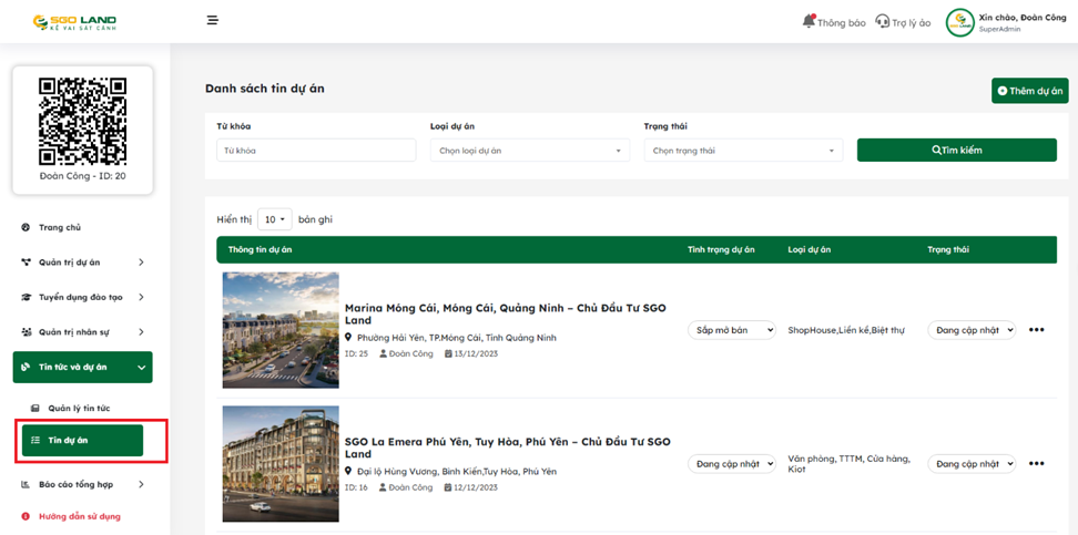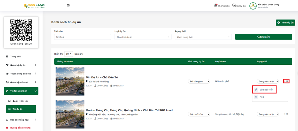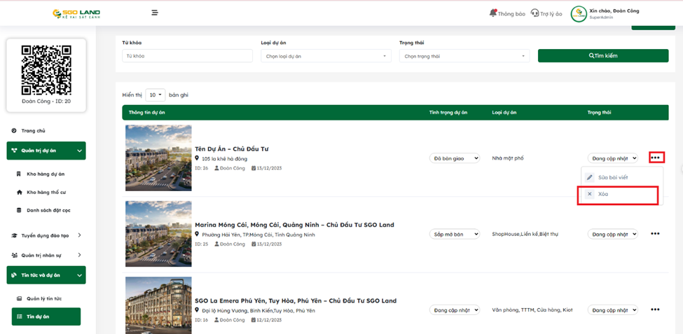 Click “Xóa” dự án của bạn sẽ bị khỏi danh sách tin dự án
